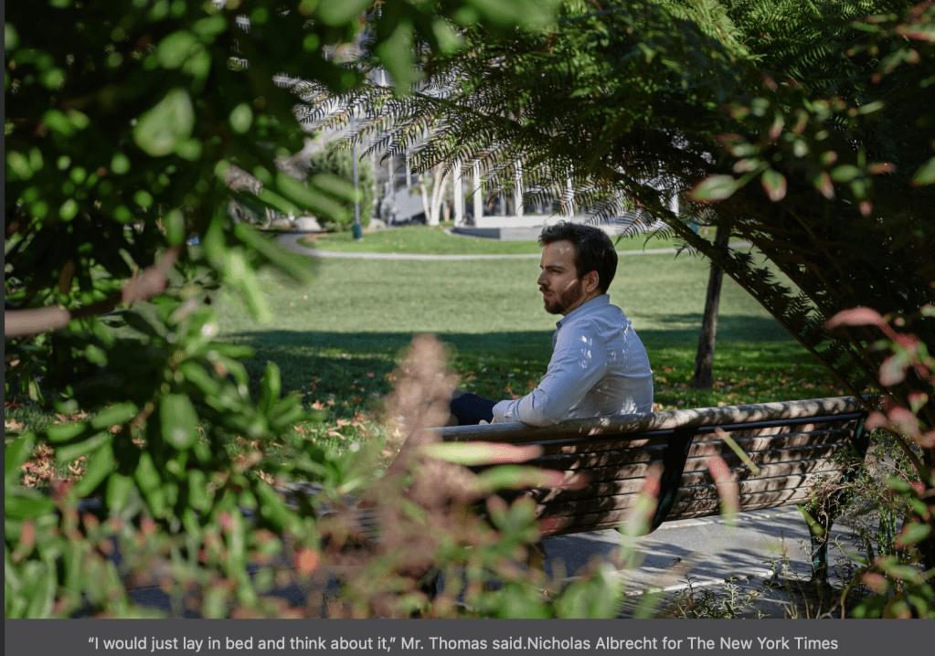 But by far the best part of this article is how the NYT continually mocks him in their patented smug way. Take the pic below (downloaded from the article). Imagine being the photographer. You ask this guy to sit on the one park bench in all of San Francisco that’s not caked in Hep-C and then tell him to look out into the distance, as if waiting for the love of his life to return. And you then snap a few photos while the ice water running through your veins keeps your laughter at bay.