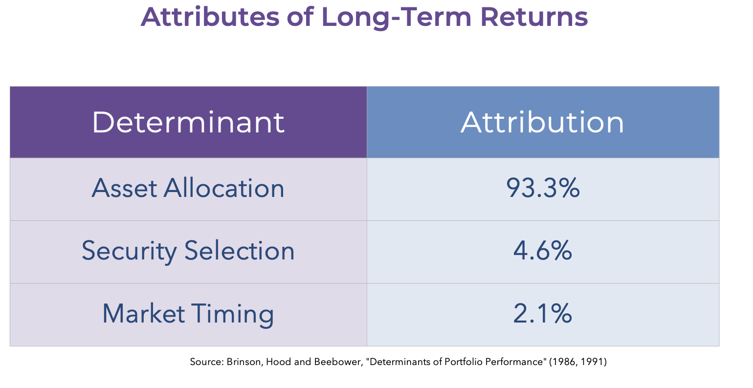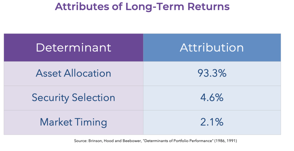 In retail land, people watch Cramer hit a horn, and they trade after hours to presumably beat the impending rush on next day’s open. I don’t want any part of this, and since the table below clearly indicates that long-term returns are fueled more by asset allocation than stock picking (security selection), I feel like I’m doing right by investors by avoiding those types of conversations.