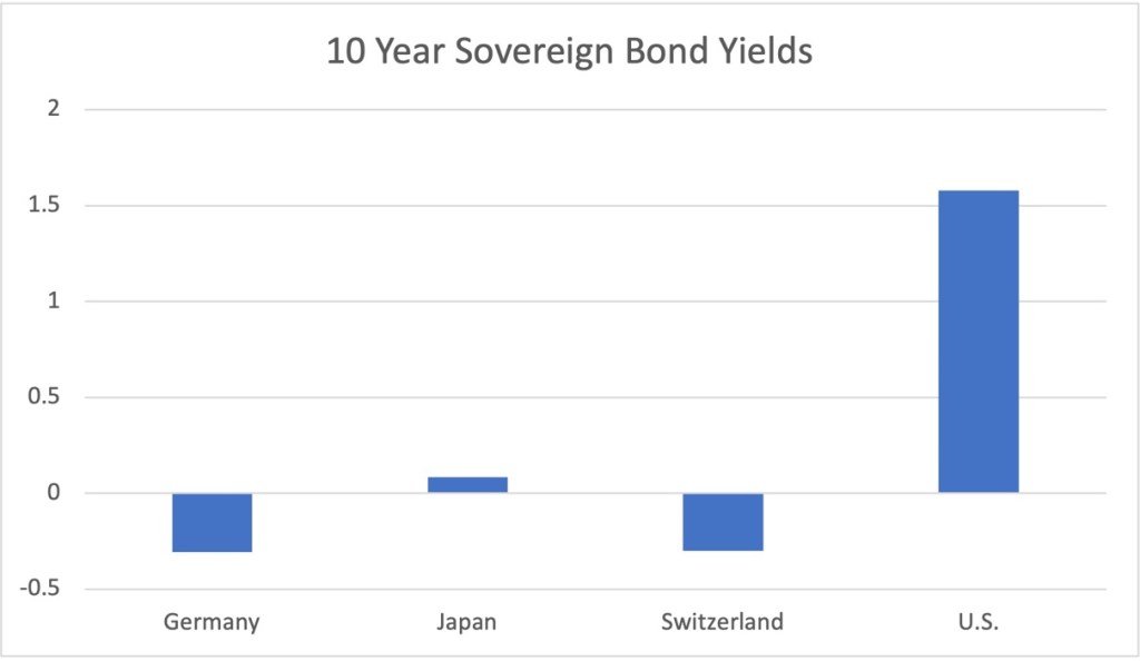 Lastly, don’t forget that a10-year Treasury yield at 1.5% compared to Japan’s or Europe’s 10-year looks pretty good right now (see chart below). My guess is this could inspire foreign buyers to step in and bid the 10-year Treasury yield down from here too. But that’s purely speculation and suggested as nothing more than food for thought.