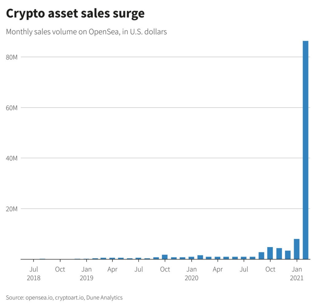 What is so shocking about NFTs is how they are being used today, which is to facilitate the purchase of digital art and ownership of 3 second video clips of LeBron dunking (again something that can be viewed on YouTube presumably for free). The sums being paid are equally staggering. We are talking millions in transactions that have exploded just this year: