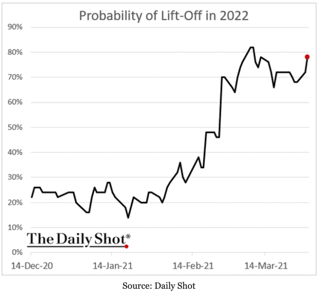 What a way to end Q1. Knowing that Coverdale and the gang align with my investment style makes me almost giddy. And speaking of being a contrarian, the chart below shows that the market is assigning an almost 80% probability of a rate hike in 2022.