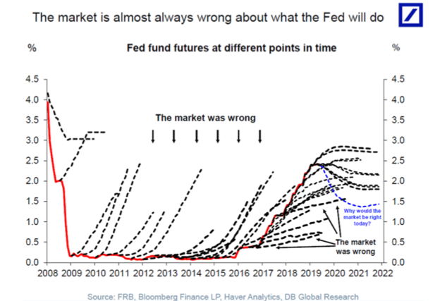 In situations like these, I like to remind investors about the chart below. I’ve written about this more than once. The short version is that the market is almost always wrong about what the Fed will do. I attached my most recent piece on this very subject that I wrote last May when this collective group of soothsayers believed that the Fed was going to take rates below zero (attached to this email).