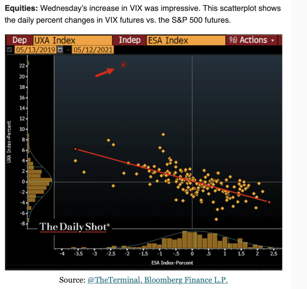I think it’s what we’ve discussed already – lots of people who don’t want to own stocks right now have to own stocks right now if they want any shot of a “real” return over time (positive return after removing the effects of inflation). Seems more plausible that these nervous nellies are spiking the VIX than crypto traders. But that’s just a guess.