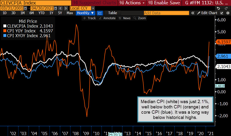 Currently, the median CPI is trending up slightly, which is an indication that broad-based inflation is rising but nowhere near what the headline numbers portray (again these are averages).