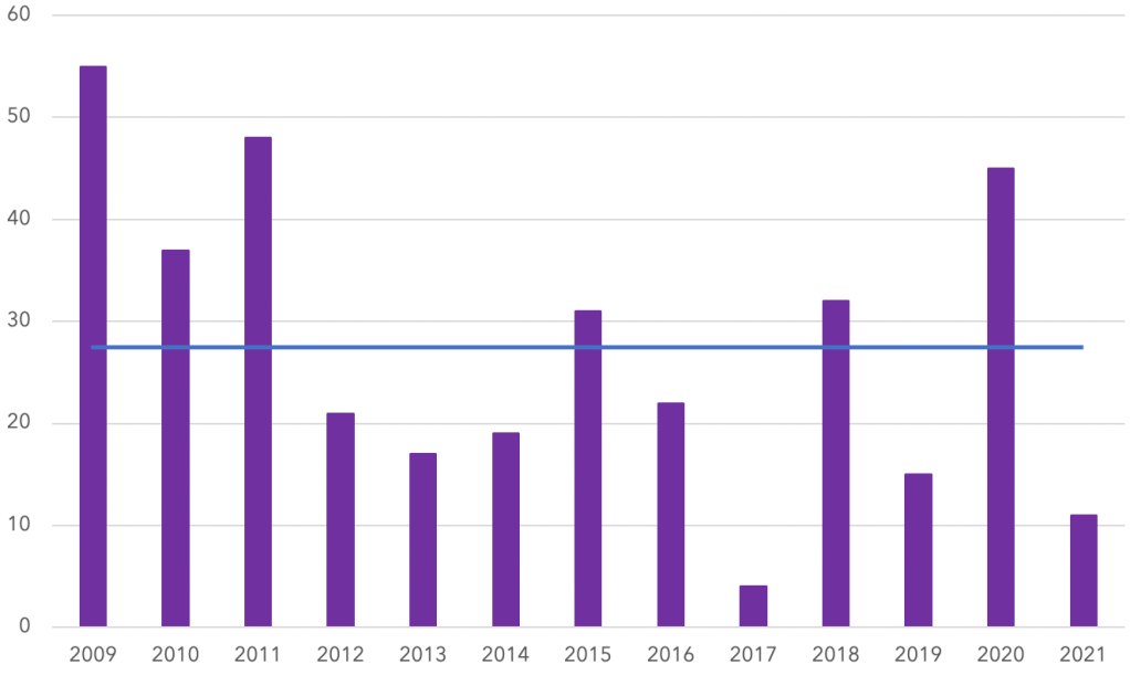 To start, let’s put this “weakness” into context. There’s been very little volatility in the S&P 500 this year. Our team put this table together, and you’ll see that the number of down days greater than 1% in 2021 is trending a lot lower than the average since 2008.