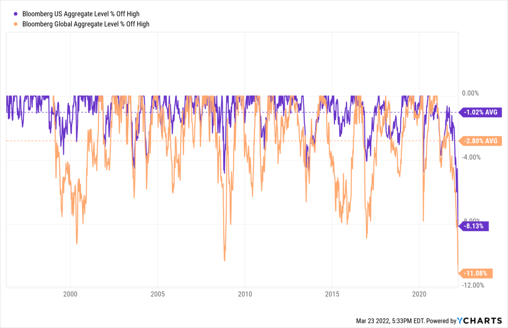 Wow! This is the worst drawdown for the Global Agg ever (data going back to 1990). It’s the worst drawdown in the U.S. since the Volker era (the early 1980s).