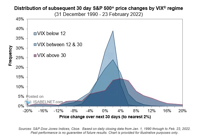 VIX above 30 has a higher average (peak is further to the right than the other two peaks) with a wider distribution (larger range of possible outcomes) AND “fatter” tails (the height of the two tails off the y-axis).