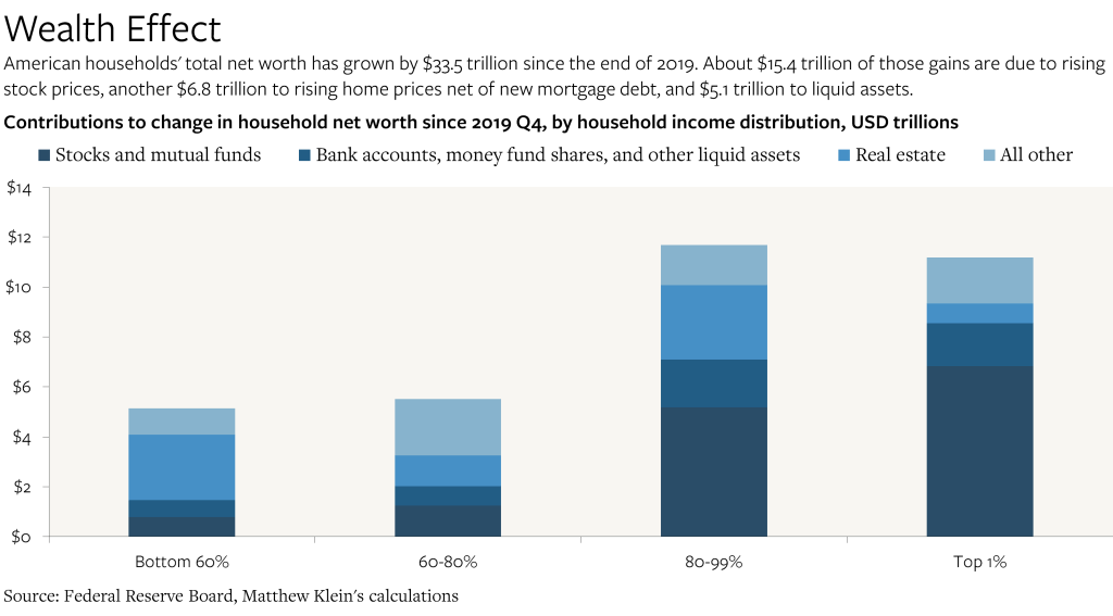 The net result is a massive wealth effect for each group in the chart above. For example, Americans in the bottom 60% of the income distribution have experienced a 24% increase in their holdings of cash and equivalents since the end of 2019 and a 30% increase in their home equity.