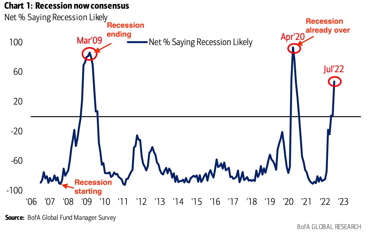 Admittedly, there aren’t a lot of recessionary data points here, but the gist is that when the percentage of fund managers that answer “yes” to the question of “whether or not we’re in a recession” exceeds the nays by a wide margin, we tend to be moving closer to brighter days.