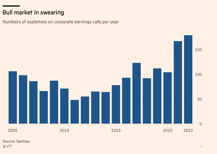The Financial Times has a great chart below showing that the number of swear words on corporate earnings calls has risen steadily.