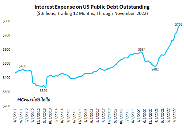 The interest expense of U.S. government debt rose to $766 billion over the last 12 months (per Charlie Bilello’s blog). That’s an all-time high, and if it continues, Mr. Bilello points out that it will soon surpass Social Security to become the largest line item in the Federal Budget.
